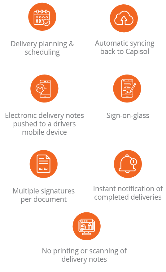 Planned deliveries are sent directly to drivers’ mobile devices, enabling on-the-spot electronic signatures that are automatically uploaded and linked to related documents in the Capisol cloud.